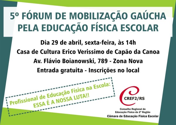 O 5º Fórum de Mobilização Gaúcha pela Educação Física Escolar será realizado no dia 29 de abril, em Capão Canoa. O evento, que vai integrar a programação do 42º Encontro Nacional dos Profissionais de Educação Física (ENAPEF), é uma iniciativa da Câmara Temática de Educação Física Escolar do CREF2/RS. A atividade, aberta para profissionais e acadêmicos de Educação Física, terá a entrada gratuita.