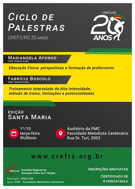 Em comemoração aos seus 20 anos, o CREF2/RS está realizando um ciclo de palestras em diversas cidades do Rio Grande do Sul. A segunda edição da atividade ocorrerá em Santa Maria, no dia 1º de outubro, e vai abordar os temas Educação Física: perspectivas e formação de professores, em uma apresentação ministrada por Mariangela Afonso (CREF 008426-G/RS); e Treinamento Intervalado de Alta Intensidade: método de treino, limitações e potencialidades, na palestra conduzida por Fabrício Boscolo (CREF 028184-G/RS).
