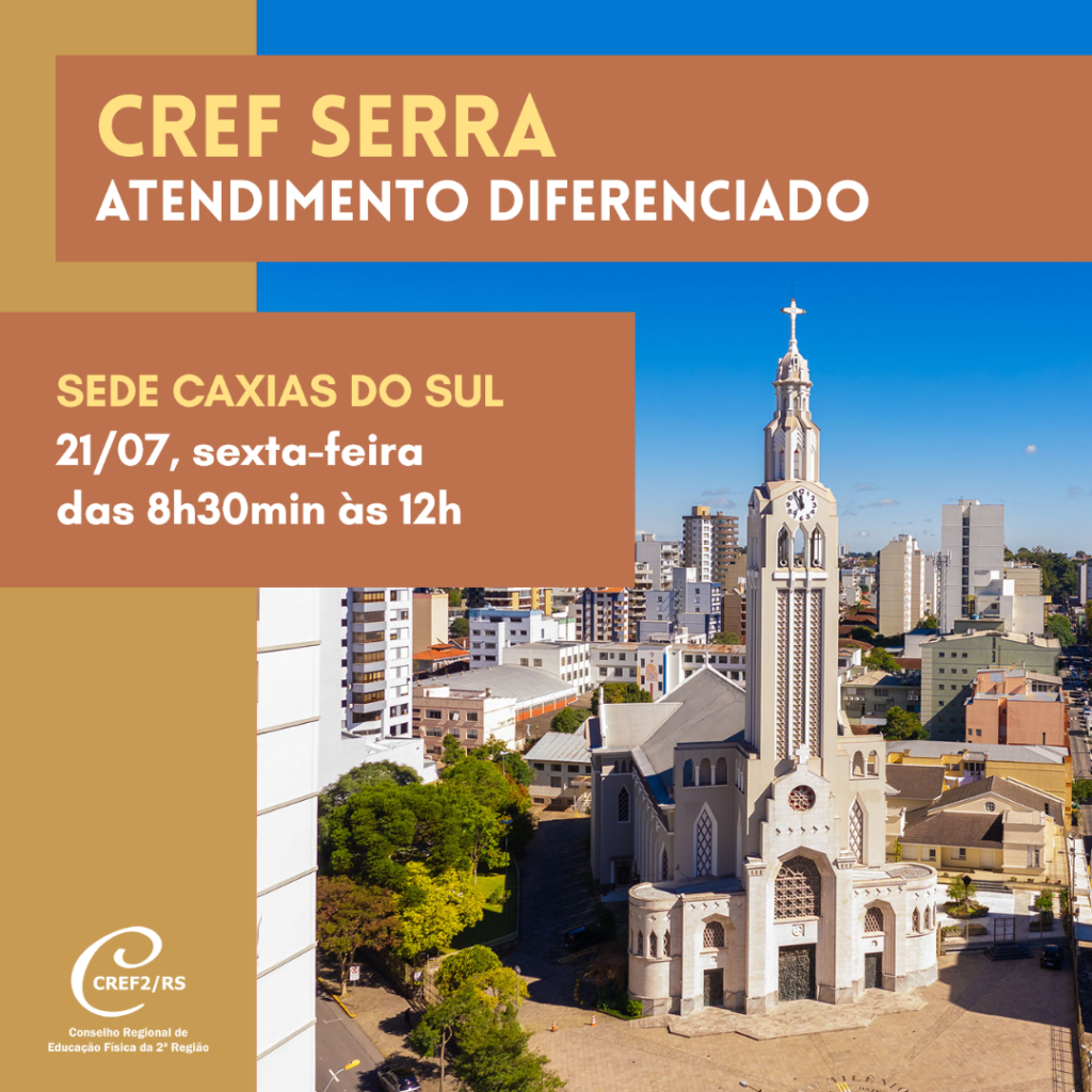 Por conta de uma atividade interna, a sede do CREF em Caxias do Sul vai ter um horário de atendimento diferenciado nesta sexta-feira, dia 21 de julho. O expediente iniciará às 8h30min e encerrará um pouco mais cedo, às 12h.