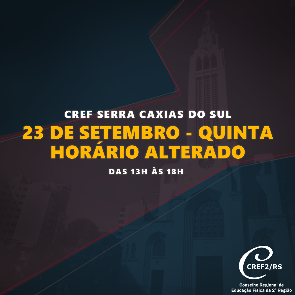 Na próxima quinta-feira, dia 23 de setembro, o atendimento do CREF Serra excepcionalmente será das 13hs às 18h. Na sexta-feira, dia 24 de setembro, o atendimento retorna a ser realizado das 10h às 15h.