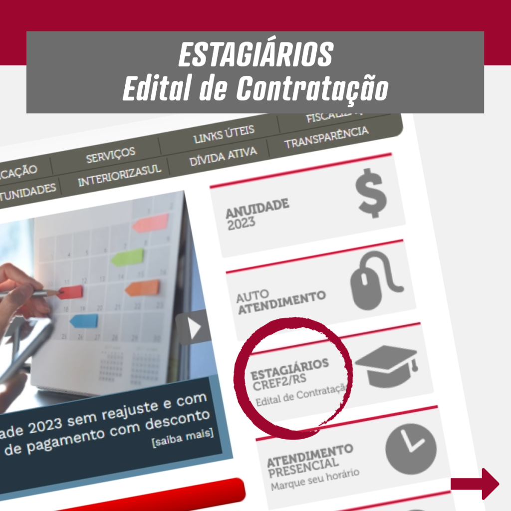 O CREF2/RS abriu um novo processo seletivo para contratação de estagiários, desta vez destinado aos alunos matriculados nos cursos superiores de Educação Física (Licenciatura e Bacharelado) e de Publicidade e Propaganda. A seleção será conduzida em duas etapas, ambas de caráter classificatório, com análise de currículos entrevistas individuais.