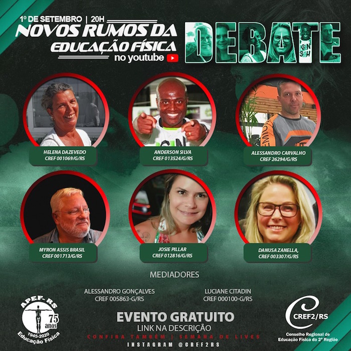 O CREF2/RS, em parceria com a APEF-RS, vai comemorar com Dia do Profissional de Educação Física com a realização de um webinário pelo Youtube. O evento Novos Rumos da Educação Física” ocorrerá na terça-feira, dia 1º de setembro, a partir das 20h, e contará com a participação dos profissionais Alessandro Carvalho (CREF 026294-G/RS), Anderson Silva (CREF 013524-G/RS), Danusa Zanella (CREF 003307-G/RS), Helena DAzevedo (CREF 001069-G/RS), Josie Pillar (CREF 012816-G/RS) e Myron Assis Brasil (CREF 001713-G/RS).