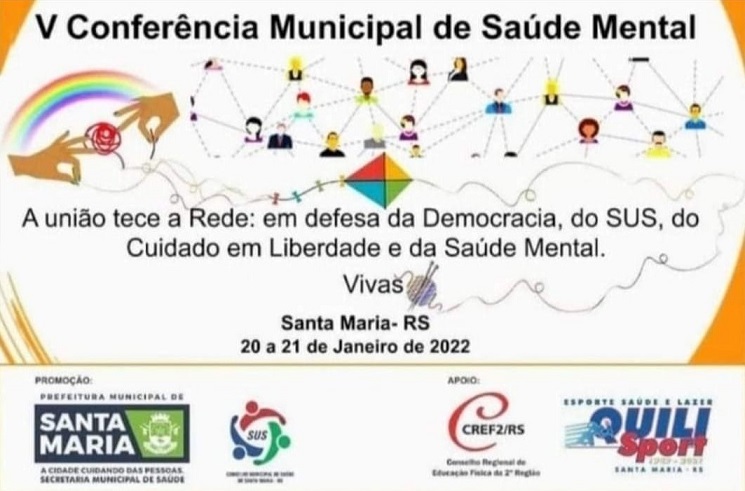 Neste ano, a Conferência Municipal de Santa Maria tem o título A união tece a Rede: em defesa da Democracia, do SUS, do cuidado em liberdade e da Saúde Mental. Esta temática também será compartilhada pela Conferência Estadual de Saúde Mental, que vai ser realizada em abril em Porto Alegre; e pela Conferência Nacional de Saúde Mental, que ocorrerá em maio em Brasília. O CREF2/RS acompanhará todas estas etapas do debate.