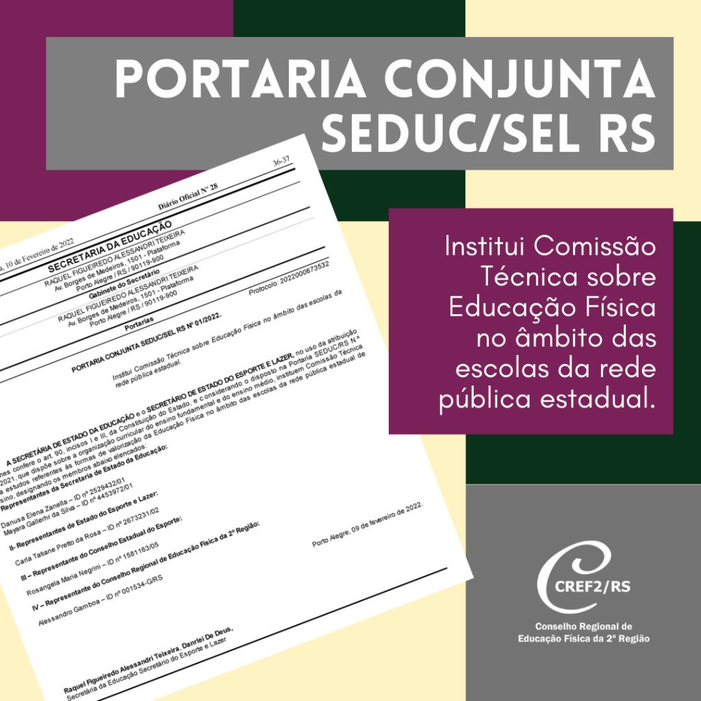 O CREF2/RS, atento aos desdobramentos da Portaria 350/2021 da Secretaria Estadual da Educação (SEDUC), teve a sua participação confirmada na Comissão Técnica para Estudos Referentes às Formas de Valorização da Educação no Âmbito das Escolas da Rede Pública Estadual de Ensino. O grupo de trabalho, que atuará na organização curricular do Ensino Fundamental e do Ensino Médio, contará com a presença do presidente Alessandro Gamboa (CREF 001534-G/RS) e da 1ª vice-presidente Carla Pretto (CREF 006564-G/RS), esta última representando a Secretaria Estadual do Esporte e Lazer (SEL).