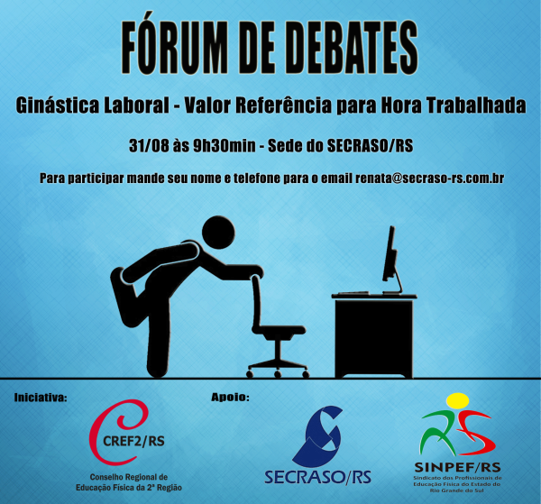 Em parceria com o Sindicato das Entidades Culturais, Recreativas, de Assistência Social, de Orientação e Formação Profissional do Rio Grande do Sul (Secraso/RS) e com o Sindicato dos Profissionais de Educação Física (SINPEF/RS), a Câmara Técnica de Ginástica Laboral e Atividade Física na Empresa do CREF2/RS vai promover, no dia 31 de agosto, um debate para a criação de um valor de referência para a hora trabalhada da Ginástica Laboral. O evento irá ocorrer das 9h30min às 11h30min, na sede do Secraso/RS em Porto Alegre, e será aberto para a participação de todos os profissionais que trabalharam na área.