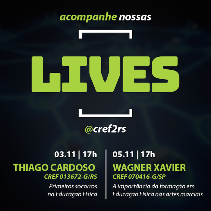 O CREF2/RS vai dar continuidade, nos próximos dias, às suas lives pelo Instagram. Na terça-feira, dia 3 de novembro, o Conselho vai receber Thiago Cardoso (CREF 013672-G/RS), que irá abordar o tema Primeiros socorros na Educação Física. Já na quinta-feira, dia 5 de novembro, o Conselho contará com a presença de Wagner Xavier (CREF 070416-G/SP), para fazer a apresentação A importância da formação em Educação Física nas artes marciais. As transmissões iniciarão às 17h, nos dois dias.