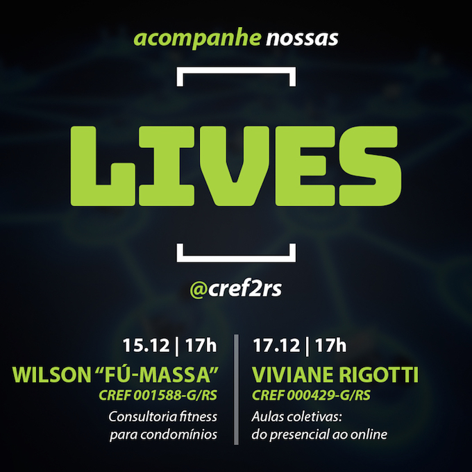 O CREF2/RS vai dar continuidade, nos próximos dias, às suas lives pelo Instagram. Na terça-feira, dia 15 de dezembro, o Conselho receberá Wilson Fú-massa Pereira (CREF 001588-G/RS), que irá abordar o tema Consultoria fitness para condomínios. Já na quinta-feira, dia 17 de dezembro, Viviane Rigotti (CREF 000429-G/RS) é quem vai estar online, para fazer a apresentação Aulas coletivas: do presencial ao online. As transmissões iniciarão às 17h.