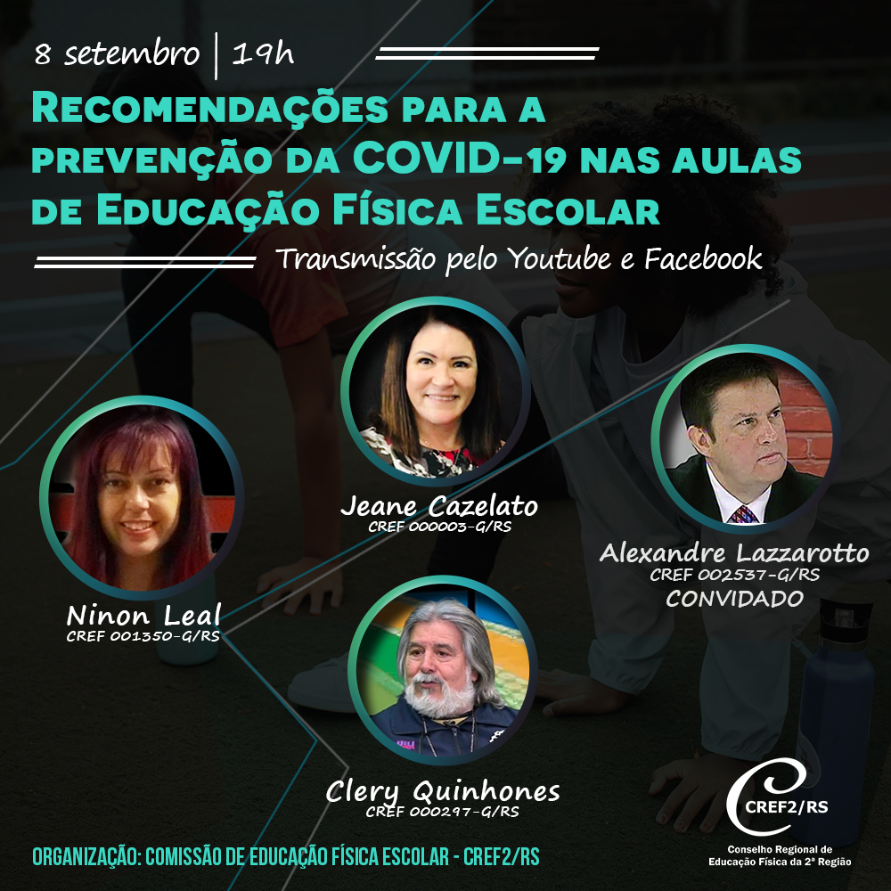 Encerrando a programação comemorativa do Dia do Profissional de Educação Física, o CREF2/RS vai realizar na próxima quarta-feira, dia 8 de setembro, a live Recomendações para a Prevenção da COVID-19 nas aulas de Educação Física Escolar. A transmissão iniciará às 19h, pelo Facebook e pelo Youtube do Conselho.