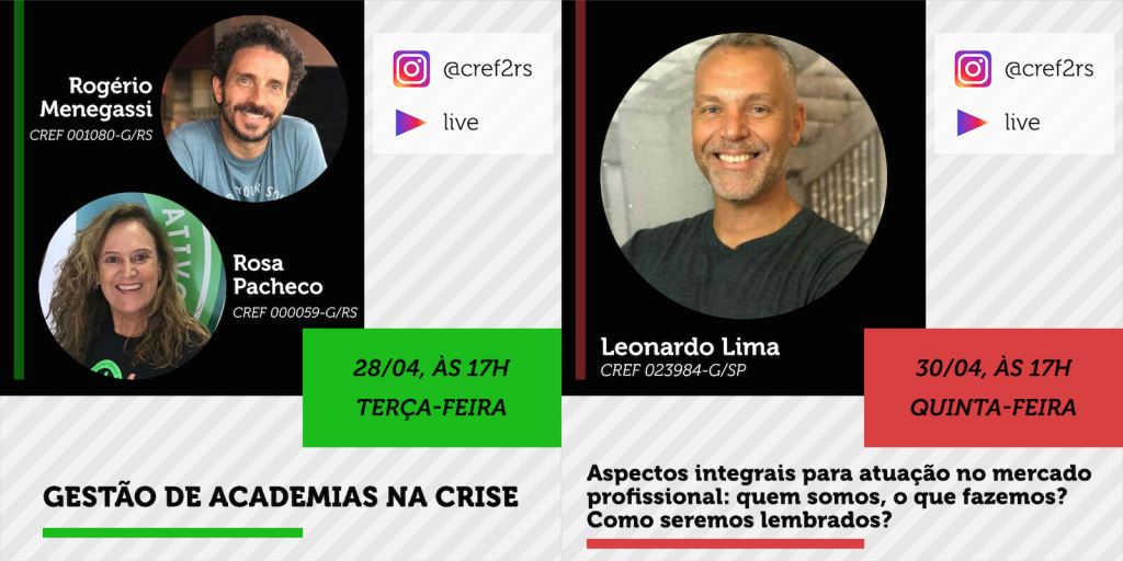 Nas próximas semanas, o CREF2/RS vai dar continuidade às suas lives no Instagram. Rosa Pacheco (CREF 000059-G/RS) e Rogério Menegassi (CREF 001080-G/RS) estarão ao vivo na terça-feira, dia 28 de abril, com a apresentação Gestão de academias na crise. Já na quinta-feira, dia 30 de abril, será a vez de Leonardo Lima (CREF 023984-G/SP) fazer a palestra online Aspectos integrais para atuação no mercado profissional: quem somos, o que fazemos? Como seremos lembrados?. As transmissões iniciam sempre às 15h ou às 17h.