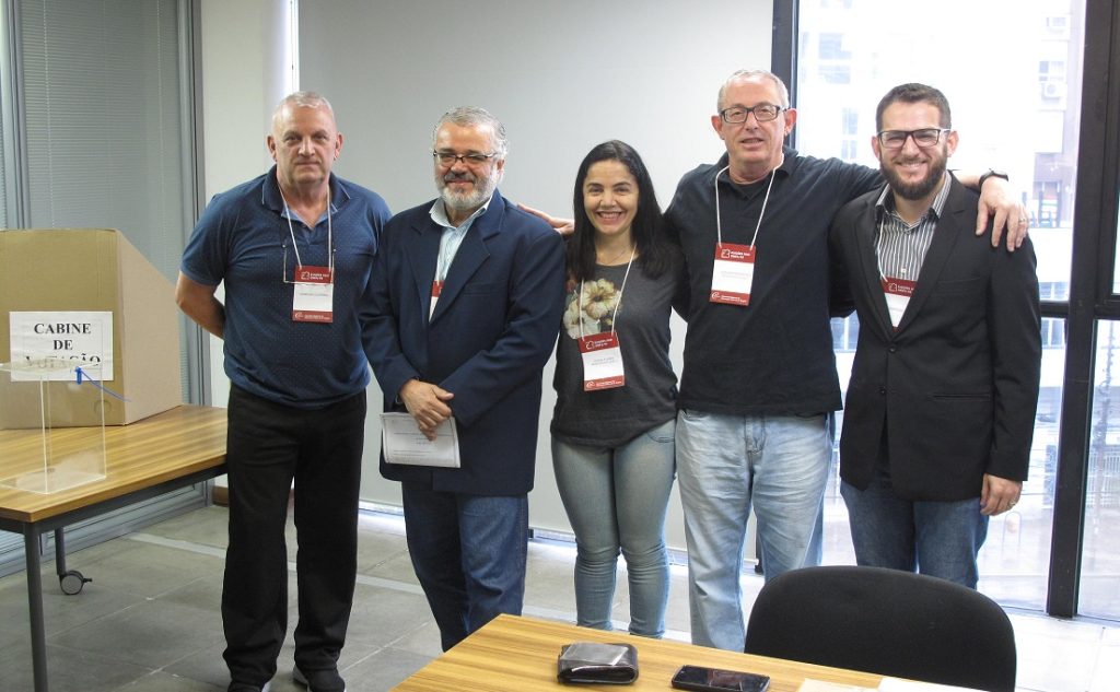 Estão na foto, na ordem, o presidente da Comissão Eleitoral Jacques Hidalgo (CREF 002325-P/RS), o representante da Chapa 1 Lauro Aguiar (CREF 002782-G/RS), a representante da Chapa 3 Eliana Flores (CREF 002649-G/RS), o representante da Chapa 2 Giovanni Bavaresco (CREF 001512-G/RS) e o integrante da Comissão Eleitoral Christyam Fraga (CREF 021700-G/RS). Mais informações sobre as Chapas concorrentes e sobre o processo eleitoral podem ser conferidas na página http://crefrs.org.br/eleicoes2018.