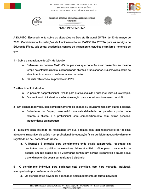 Considerando as restrições de funcionamento dos serviços de Educação Física durante a bandeira preta do Distanciamento Controlado, o Governo Estadual fez algumas alterações no Decreto 55.789. A nota informativa abaixo, assinada pelos conselheiros do CREF2/RS Alessandro Gamboa (CREF 001534-G/RS) e Carla Pretto (CREF 006564-G/RS) e pela representante do Centro Estadual de Vigilância em Saúde Cynthia Molina-Bastos, esclarece estas alterações: