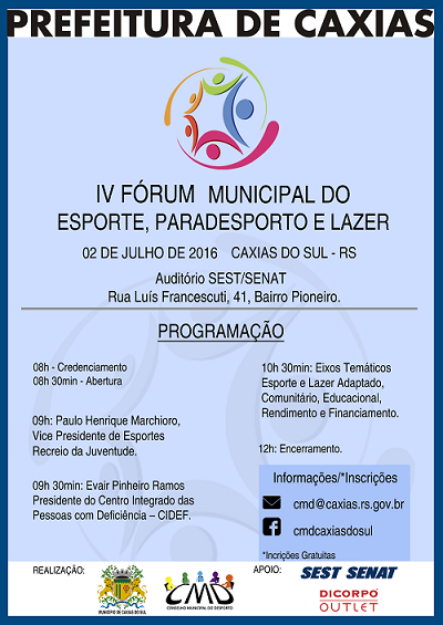 A Prefeitura de Caxias do Sul e o Conselho Municipal de Desporto (CMD) vão realizar, na manhã do dia 2 de julho, o IV Fórum Municipal do Esporte, Paradesporto e Lazer no auditório SEST/SENAT, localizado na rua Luís Fracescuti, n.º41, bairro Pioneiro.