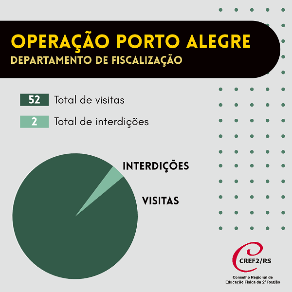 No mês de agosto, o Departamento de Fiscalização (DFis) realizou uma ação especial, denominada Operação Porto Alegre. Inspecionando 52 estabelecimentos na capital, os agentes fiscais do CREF2/RS autuaram 23 pessoas por exercício ilegal da profissão e interditaram duas academias, que funcionavam de maneira totalmente irregular.